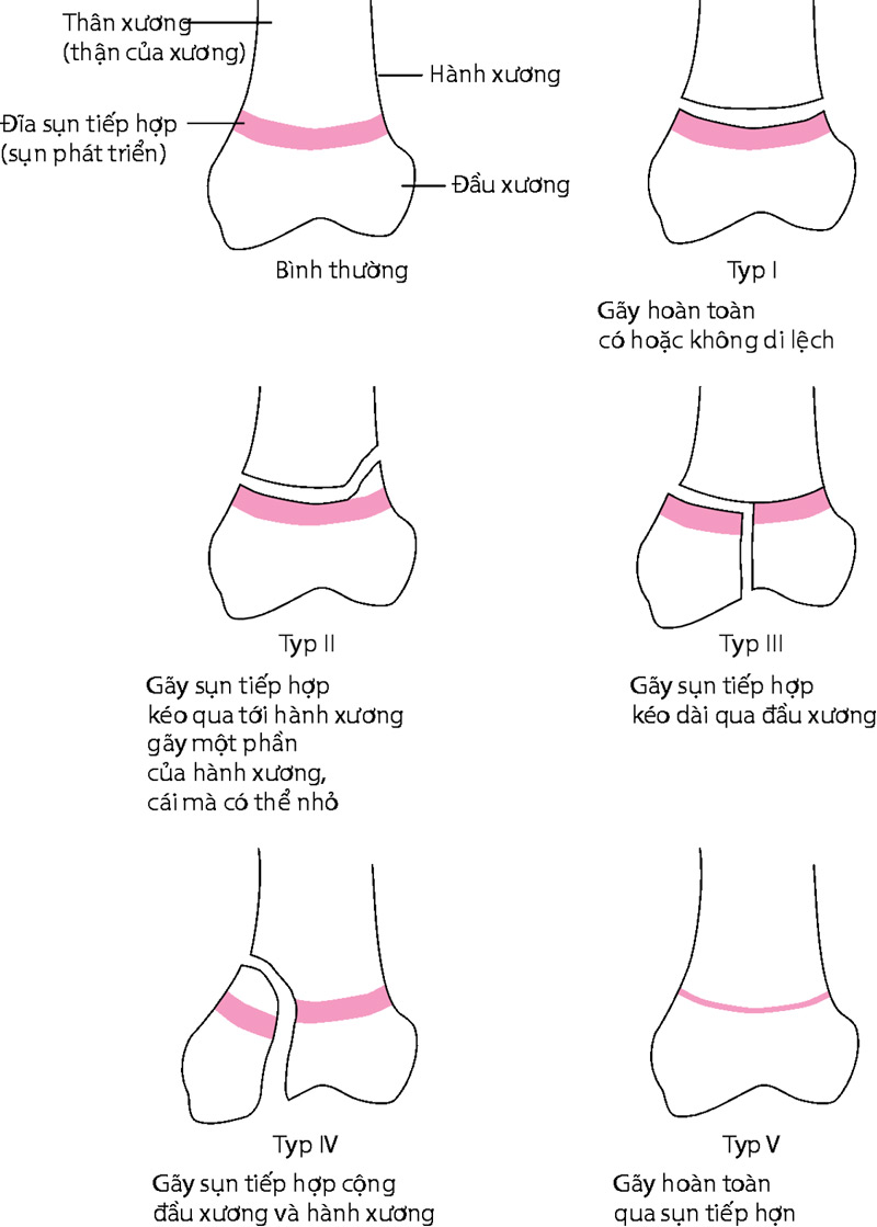 Các loại gãy sụn tăng trưởng với đường gãy được đánh dấu rõ ràng.