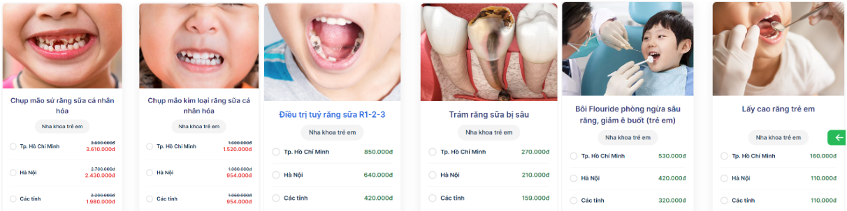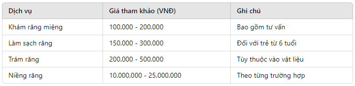 Khi đưa trẻ đến nha khoa trẻ em, phụ huynh thường quan tâm đến chi phí dịch vụ. Dưới đây là bảng giá dịch vụ cơ bản tại các phòng khám nha khoa trẻ em phổ biến tại TP. HCM: